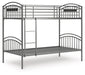 Made with welded tubular steel frameDurable steel gray powder coat finishTubular steel slats for mattress supportTop bunk with protective side railsSturdy ladder leads to top bunkLadder with left or right side convertibilityBunk can convert into two twin bedsBed does not require additional foundation/box springMattress available, sold separatelyThe Consumer Product Safety Commission states top bunks not be used for children under 6 years of ageAssembly required