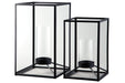 This minimalistic 2-piece lantern set lights up your home in a sleek way. Black finished metal is beautifully crafted in a linear manner. Perfect for indoor or outdoor use. Place the candle of your choosing in the clear glass to make these lanterns your own.