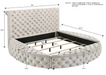 This avant-garde bed is a luxurious retreat, blending opulence with innovative design. Its unique round form challenges traditional bedroom aesthetics, offering a lavish centerpiece that is as comfortable as it is striking. The bed is generously upholstered in a plush ivory velvet, featuring exquisite button-tufted detailing throughout, which is both visually appealing and sumptuously tactile. Glamorous accents are provided by the studded embellishments along the headboard, adding a touch of sparkle and sophistication. The bed’s innovative design includes a practical storage system, discreetly hidden to maintain its sleek profile.