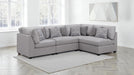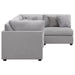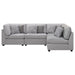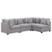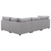 • Modular design adds versatility to stylish contemporary sectional sofa with soft gray upholstery