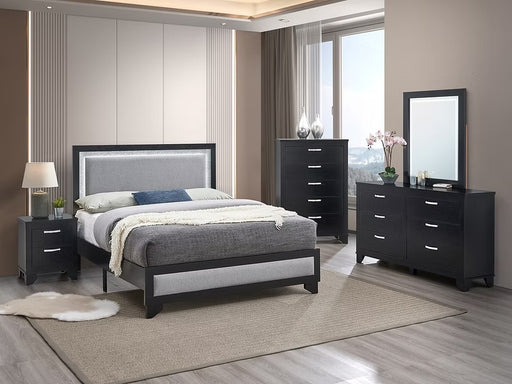 View full detailsLadonna Gray LED Upholstered Storage Bedroom Set | B214Modern gray finish with replicated wood grain. Cases and bed are accented with faceted chrom...