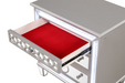 - The Mairead set leans hard into its glam-inspired aesthetics. The button tufted headboard and footboard feature bold colors while surrounded by glowing LED lights. Mirror accents grace the panels of the bed and each of the case goods' drawer faces. Also equipped with bluetooth speaker on the headboard for easy connect via all devices equipped with bluetooth pairing. Serving as a vanity replacement for your bedroom, light bulbs row the top edge of the matching mirror.
