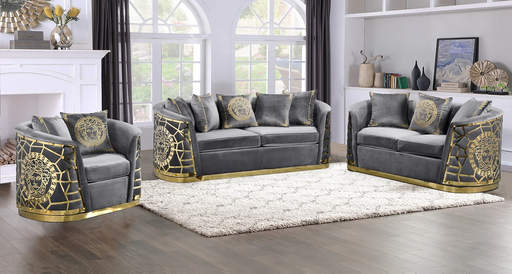 View full detailsSofa 87.5" W x 35" D x 33.5" H Loveseat 72" W x 35" D x 33.5" H Chair 46" W x 35" D x 33.5" H Features: Velvet with Gold Trims...
