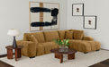 Warm, soft upholstery adds dimension to the mid-century flair of an L-shaped sectional sofa