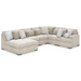 Includes 6 modular pieces: oversized armless chaise, 3 armless chairs, right-arm facing corner chair and wedge"Left-arm" and "right-arm" describe the position of the arm when you face the pieceModular pieces can float anywhere; sides are finished (with no connectors); versatile modular pieces fit together in a variety of configurationsCorner-blocked frameLoose seat and reversible back cushionsHigh-resiliency foam cushions wrapped in poly fiberIncludes throw pillows, accent pillows, decorative round pillows and lumbar pillows; pillows with soft polyfillPolyester upholsteryLow-profile legs with faux wood finish Platform foundation system resists sagging 3x better than spring system after 20,000 testing cycles by providing more even supportSmooth platform foundation maintains tight, wrinkle-free look without dips or sags that can occur over time with sinuous spring foundationsEstimated Assembly Time: 15 Minutes