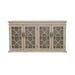 Traditional with country flair, this accent cabinet makes a fine furniture piece for a modern farmhouse style home. A light honey finish with a subtle weathered look adds a rustic charm, while glass panel cabinet doors feature a classical trim design. A double set of cabinet doors invite you to organize books and server sets, making is suitable for a living room or dining room space. Fastened on each of the four doors is an antique-style hardware pull with a contrasting dark bronze finish that lends a classic touch. A flush base offers extra stability and support while a spacious narrow tabletop offers room for table lamps and decor.