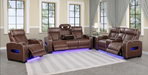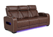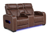 - Sofa features a drop-down table with LED reading lights, an A/C power port, cup holders, USB ports.