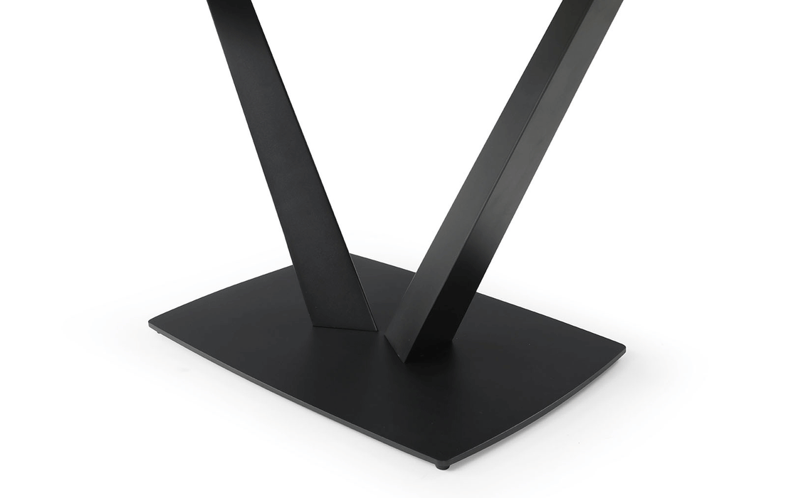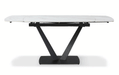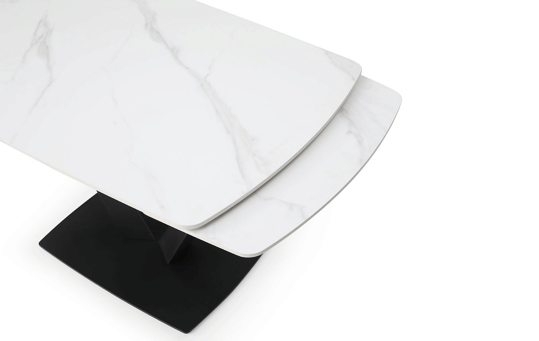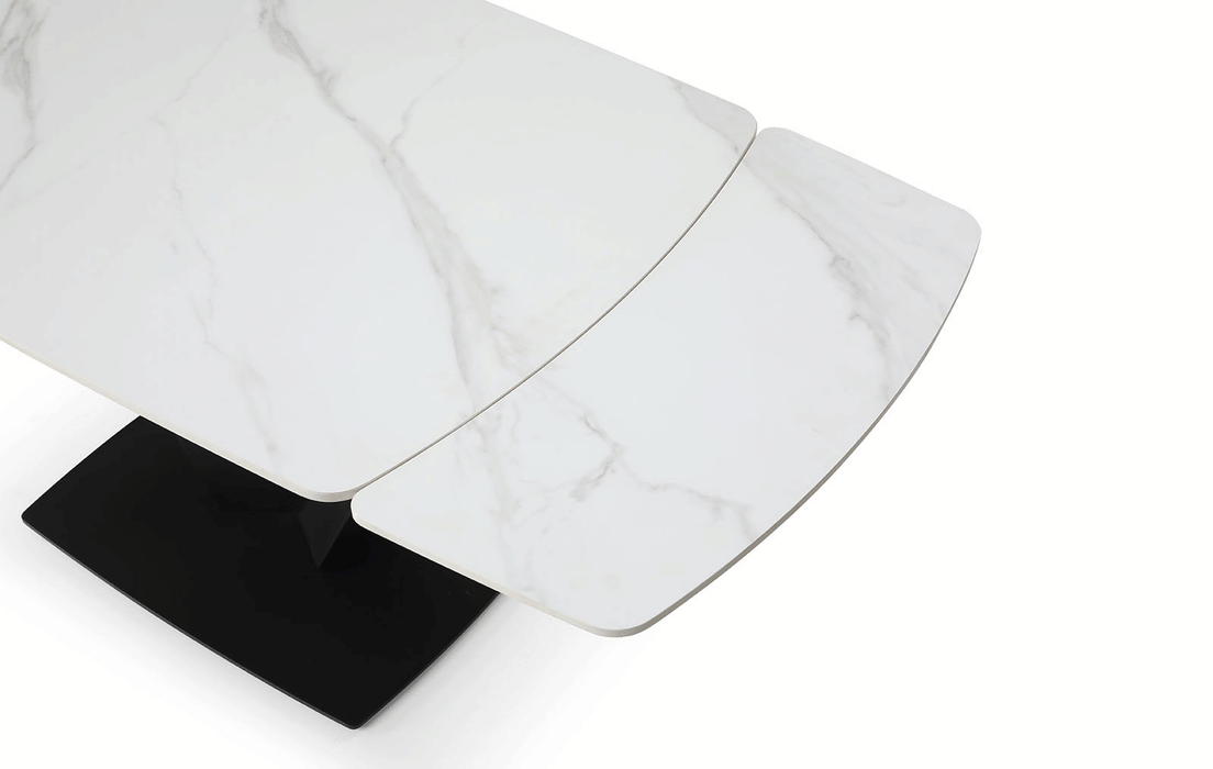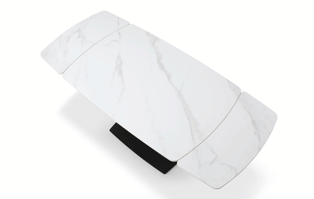 Sophisticated dining table with an extended ceramic top. Table Top & ext : 11mm solid ceramic matt white marble pattern Base: Black sanding powder coating Two 2 x 12'' Extensions Dining chairs: Fabric: Lamb Wool Fabric Legs: Black sanding powder coating