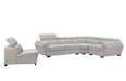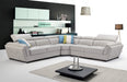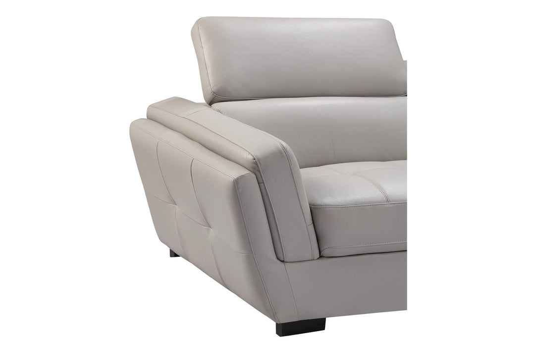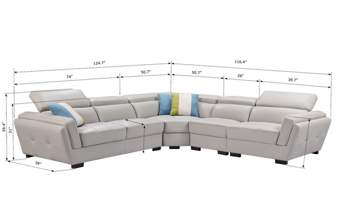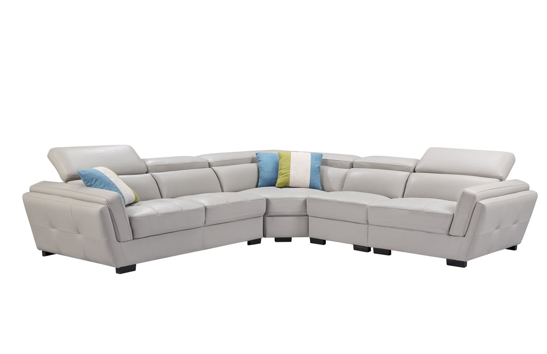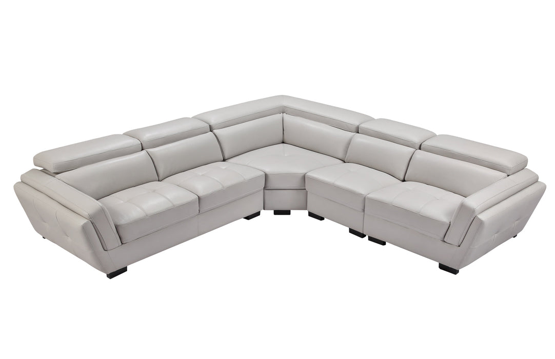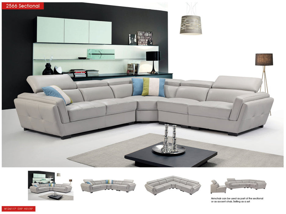 2566 Leather sectional is fashionably and stylish. Seats and backs have medium-density foam to give you extra comfort and support.Modern design leather sectional with exchangeable configuration. You can make left or right side longer just by removing armless chair and inserting it to the other side or you can use it as an accent piece. Stock leather Color: Light Grey 982 3 Fabric Pillows Included Adjustable headrests Material: Top-grain Leather/Eco Leather Back