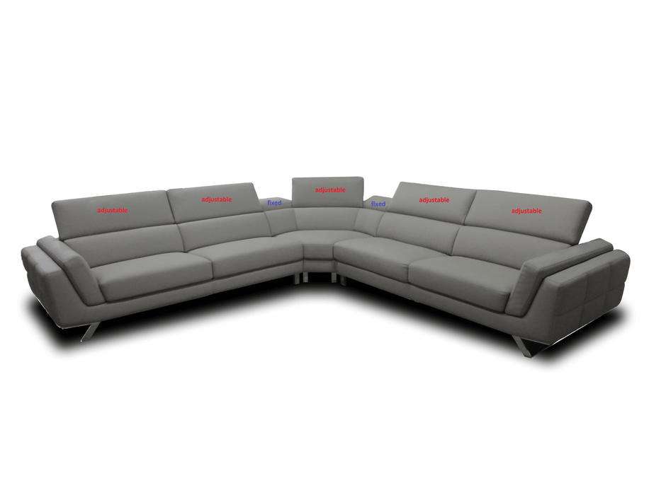 This stylish top grain leather L-shaped sectional with chaise is ideal for any living room or TV Room. Featuring top grain leather in popular light grey color and enough seating for 7, this couch is ideal for any home. Leather color #A99 LIGHT GREY