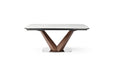 SOON IN STOCK! Elegant extended ceramic top dining table. Table Top : 8mm glass + 3mm ceramic Base: Solid wood with walnut veneer + shiny stainless steel Two 16'' Extensions Chairs Fabric: REF-119 Base: Black powder coated frame + solid wood in walnut Color: silver shiny stainless steel