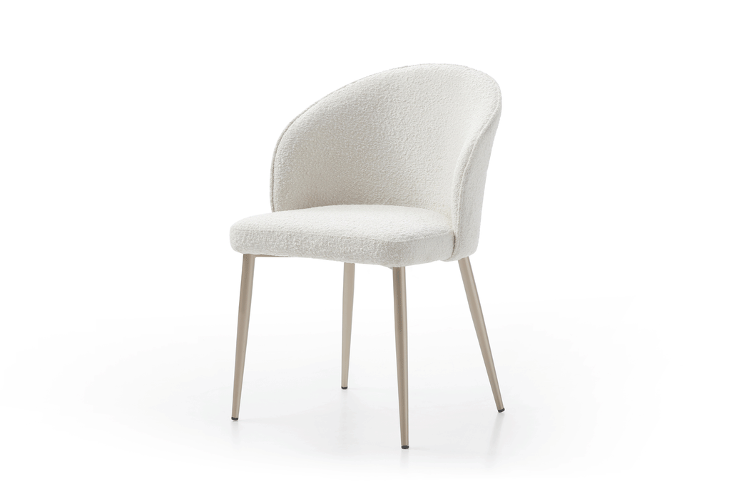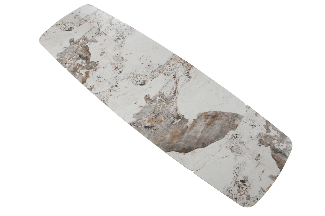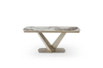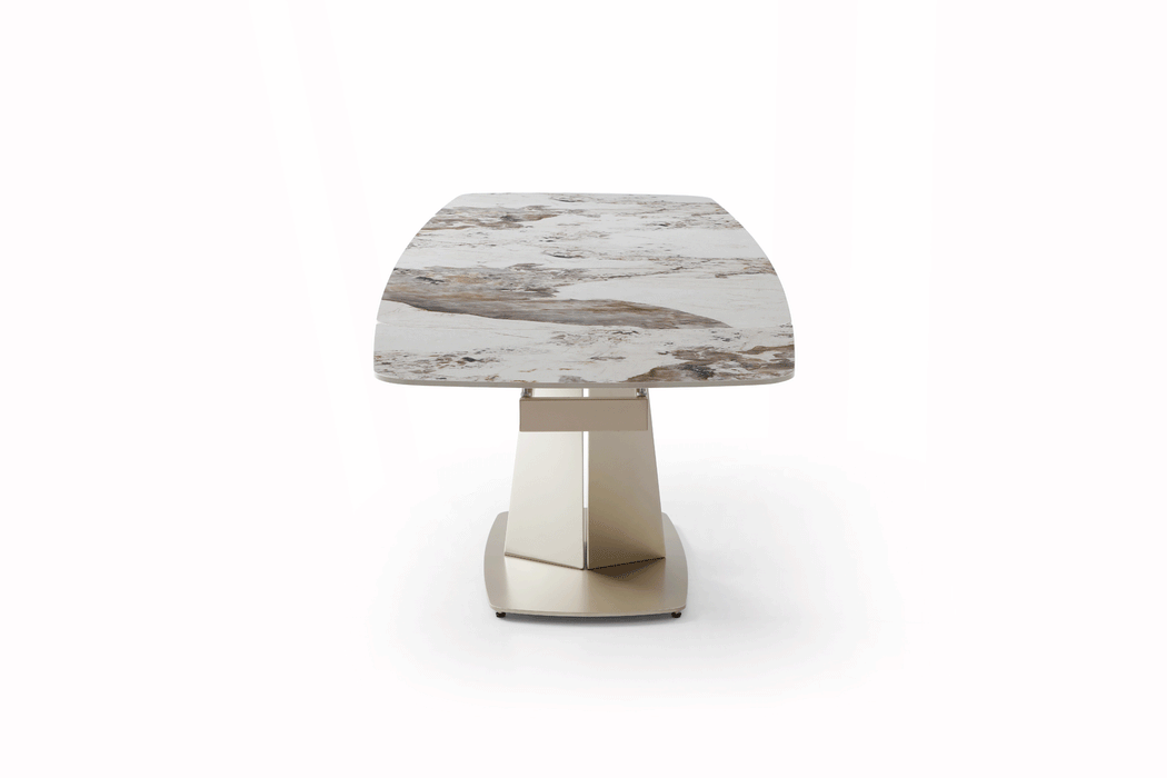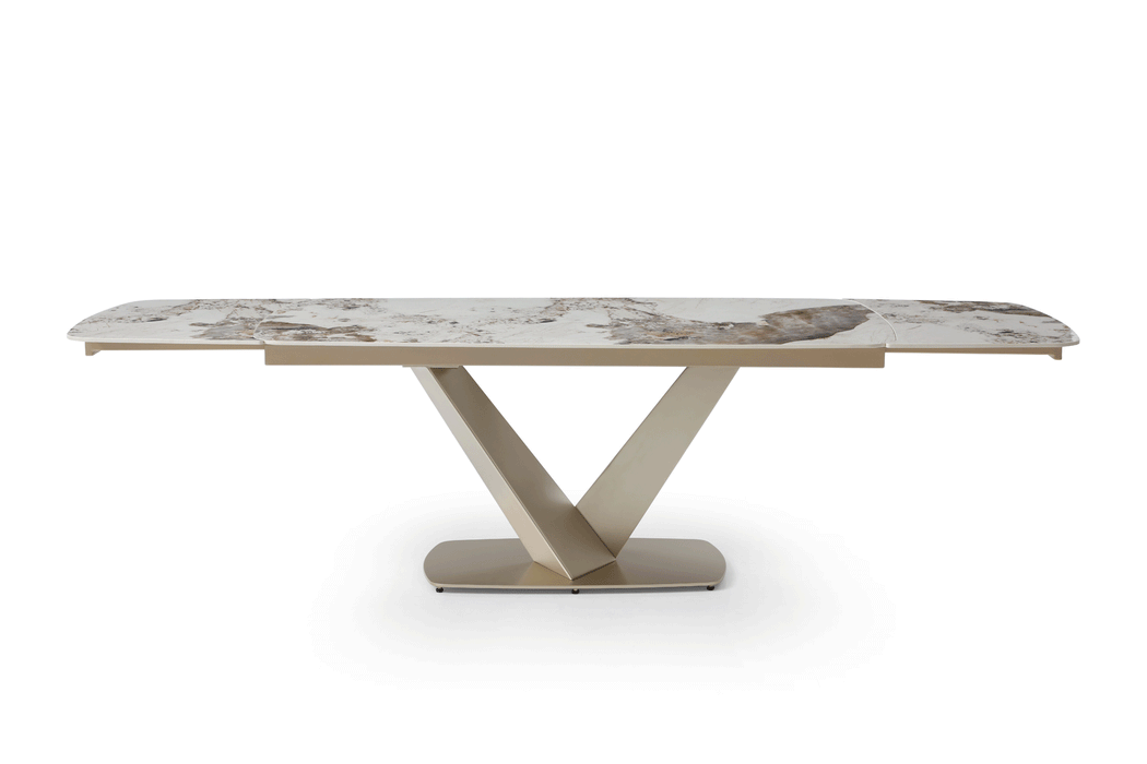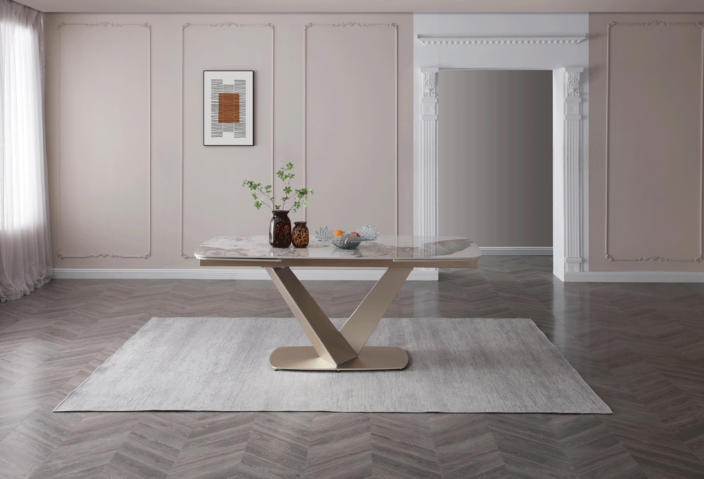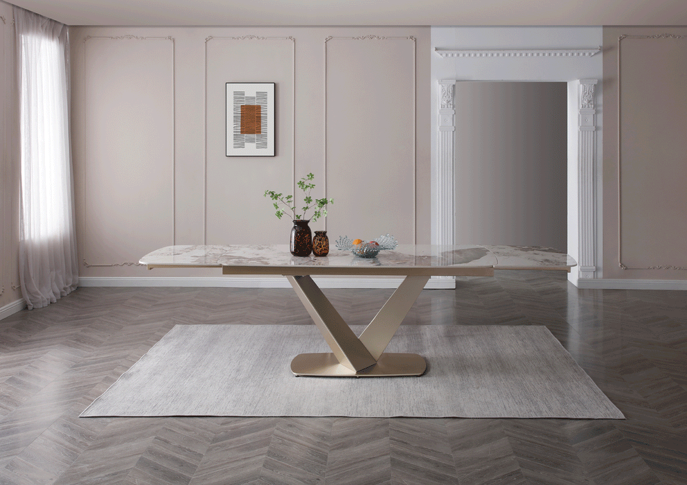 Sophisticated dining table with an extended ceramic top. Table Top & ext : 11mm gloss solid ceramic in Glossy Luxury Pandora Base: Golden Champagne painting Two 2 x 19.5'' Extensions Dining chairs: Fabric: Lamb Wool Fabric Legs: Golden Champagne painting