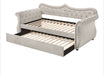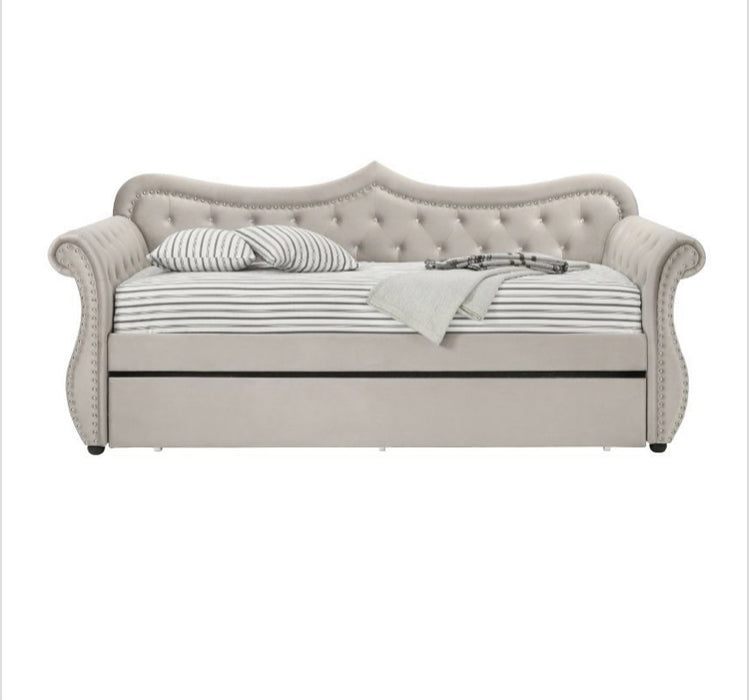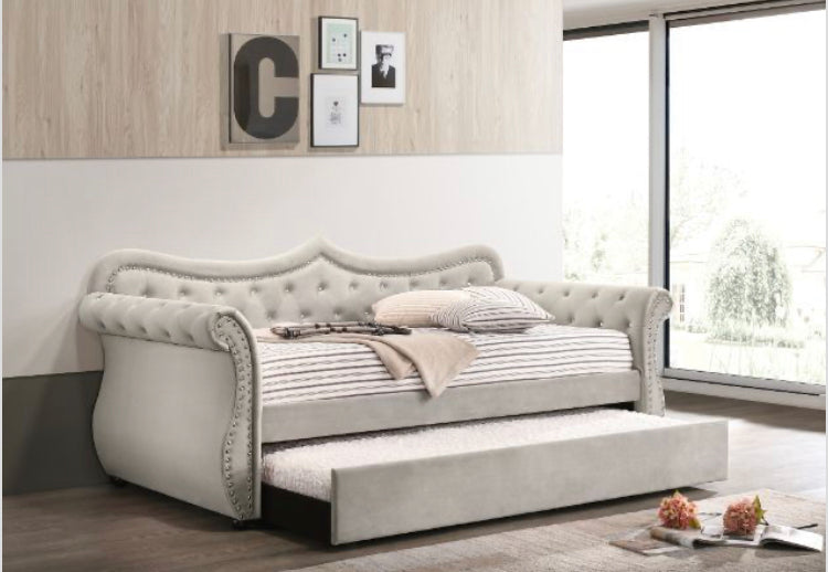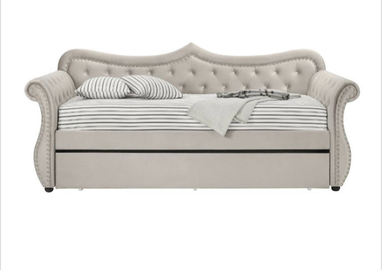 Create a dream bedrooms for your little ones with the Adkins Daybed that truly make their dream come true. The frame of the bed strikes a classic silhouette with gentle curves and sleigh-style arms, fully upholstered in a sofa velvet. Beautiful accents are seen throughout the daybed such as the button tufted details and nail-head trim accent. An additional trundle underneath the daybed adds extra sleeping space for a sibling shared room