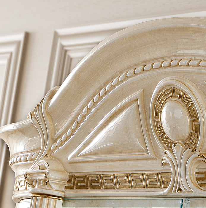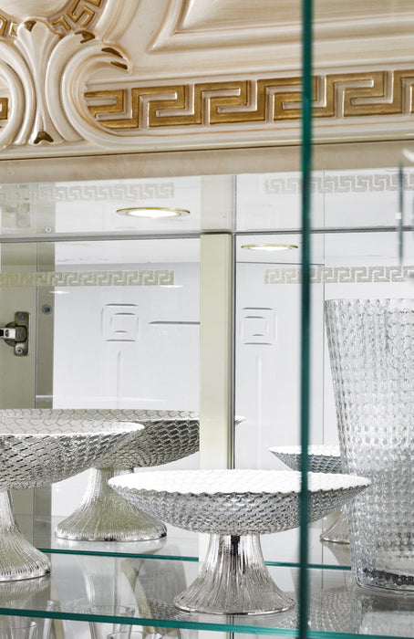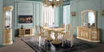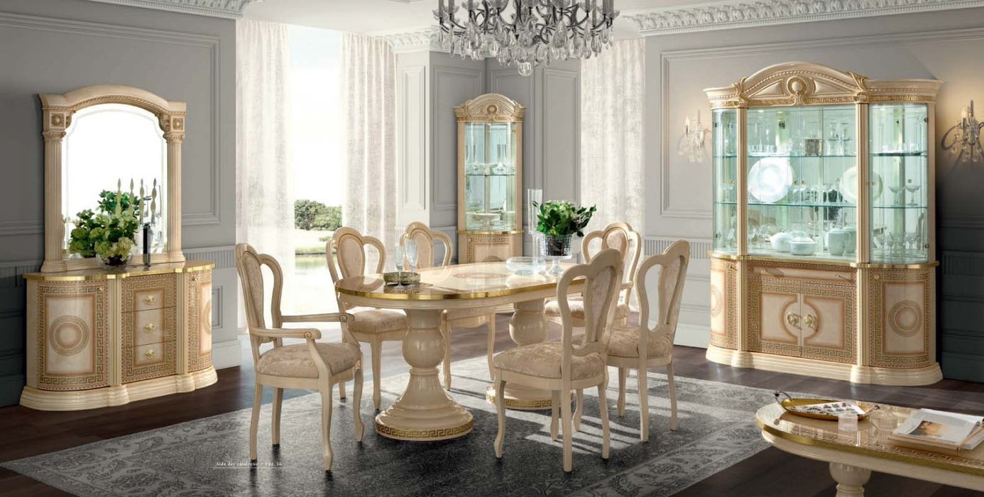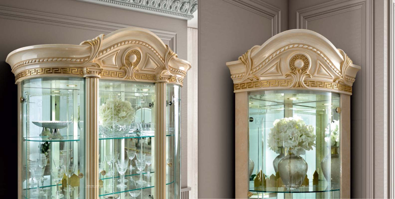 Rich and precious details exalt the luxurious features of dining room AIDA. A unique product where the creative fantasy of the Made in Italy meet the taste of the person who likes home atmospheres full of charm and majesty. Chairs : Fabric col. Ischia 705 All china cabinets requires professional assembling!!!