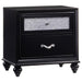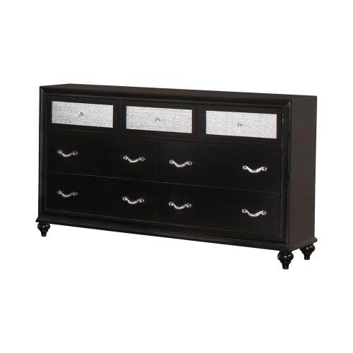 For a glam look with plenty of bling and panache, look no further than this stunning 4-piece bedroom set from the Barzini collection. The bed features an imposing headboard and low footboard with metallic leatherette-padded upholstery. The nightstand and dresser both have metallic acrylic drawer fronts accentuated by faceted crystal hardware. The majestic dresser also includes room for the tall, rectangular wood-frame mirror. The entire set is finished in a timeless black that conveys a Godfather-esque dark glam ambiance to the bedroom.