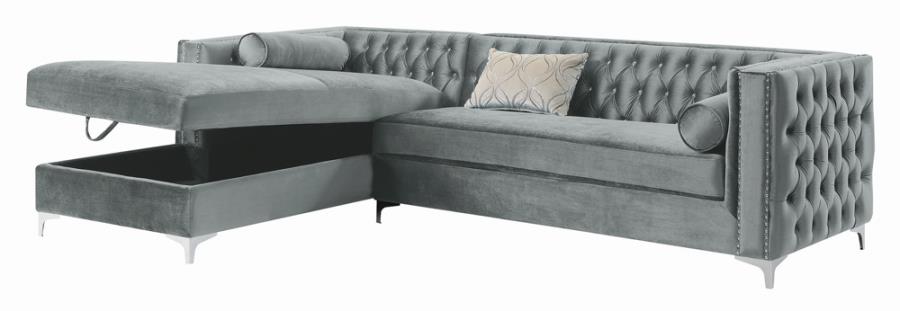 | * The Bellaire collection brings luxury and glamour into any space * Rich, velvet upholstery features button-tufted details and shelter arms * Individually placed nail heads adorn the frame for an additional touch of glam * The chaise is not only used for lounging, but for functionality with hidden storage under the seat * Accent lumbar pillow with sequin detail and two bolster pillows are included * High gloss tapered legs in chrome * Only available as shown with left arm facing storage chaise |