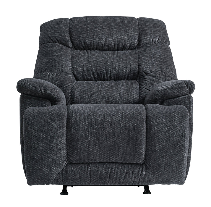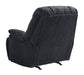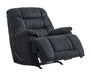 Sit back, relax and kick up your feet. Immerse yourself in total comfort as this rocker recliner embraces you with the cool look of leather and the warm, cozy feel of fabric. Plush, pillowy cushions, an oversized headrest pillow and wide pillow top armrests feature heavyweight stitching in a stunning shade of charcoal gray. The warm, welcoming look fits easily with other colors in the room and is right at home with a variety of design styles. A comfortable big and tall high-back profile allows an abundance of softness that is over the top.