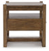 This end table sits comfortably at the intersection of modern lodge and farmhouse aesthetics. Your warm and welcoming disposition is reflected in the charming architectural elements and light brown glazed finish. Even with its poise, this table remains practical. A drawer and unique open shelf design encourage you to store and display in style.