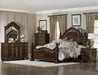 Old-World European styling is captured in the dramatically elegant Catalonia Collection. Traditional design elements reign at every turn – egg and dart molding, acanthus leaf carving, bead molding, gold tipping and extravagant carvings – creating a sophisticated look for your bedroom. Each drawer front features antiqued brass fixed-drop hardware with decorative flourish that furthers the elegant appointments that embellish this collection. A traditional cherry finish is utilized to highlight the cherry veneer of the set and decorative inlay patterns found on the case good tops. Metal scrollwork provides additional visual interest to the headboard, footboard and mirror framing.