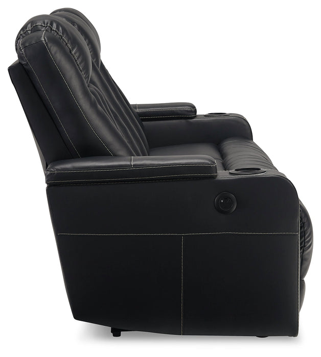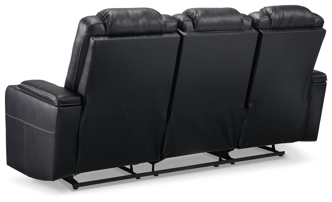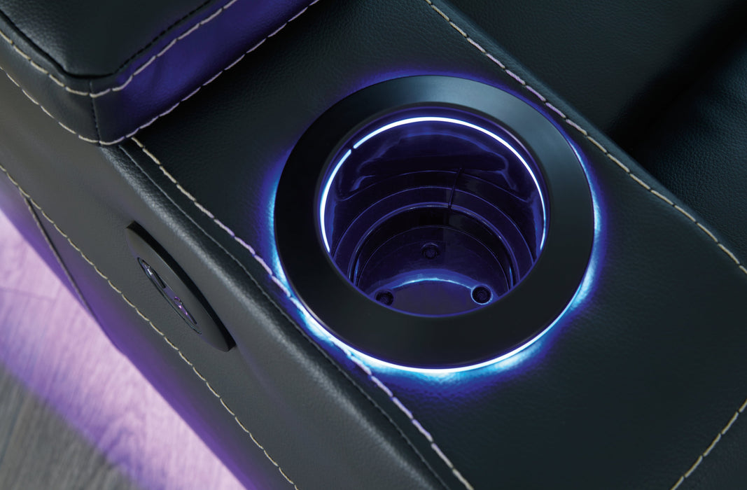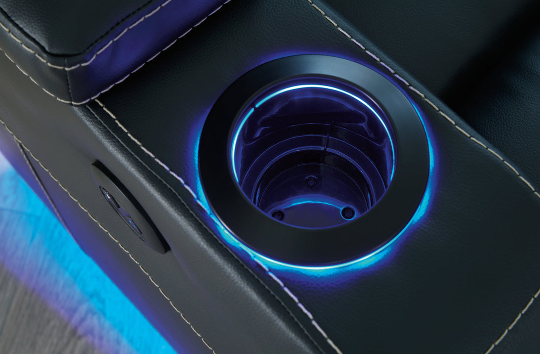 Not your father’s easy chair, this reclining sofa with drop-down table brilliantly showcases the next generation of recline design. Transform game or movie night into an interactive sensory experience with the touch of a button. Built-in LED lighting lets you choose from a range of colors for a captivatingly cool vibe. Use the light control button to sync with any device within range and cycle through the colors to the beat of the bassline. Sleek faux leather with distinctive stitching enhances the form and function of this simply striking piece.