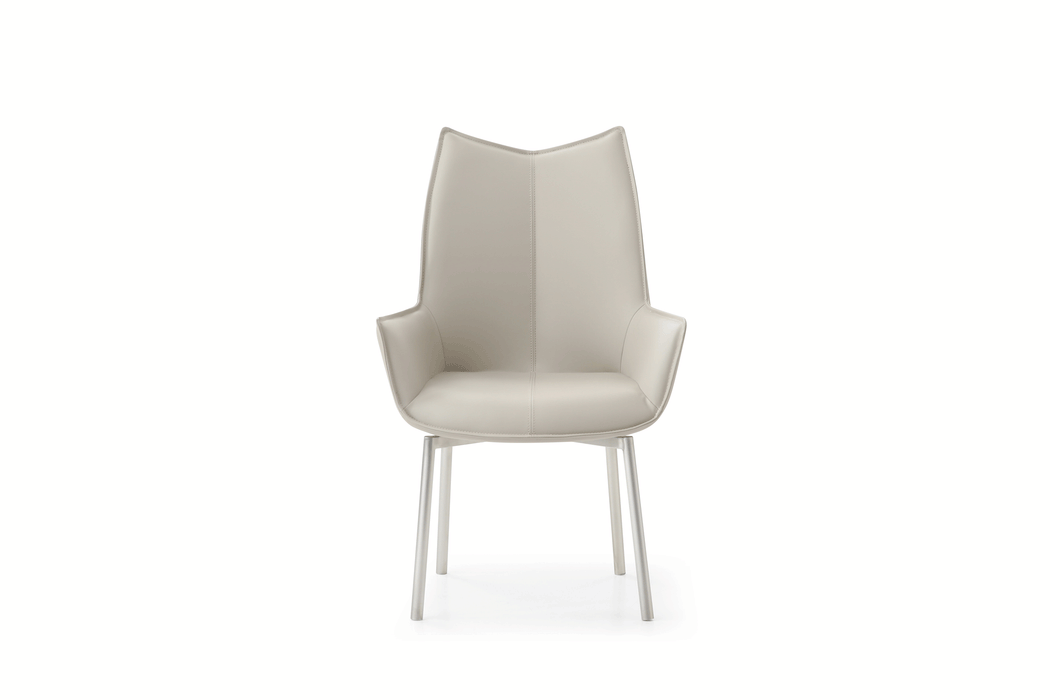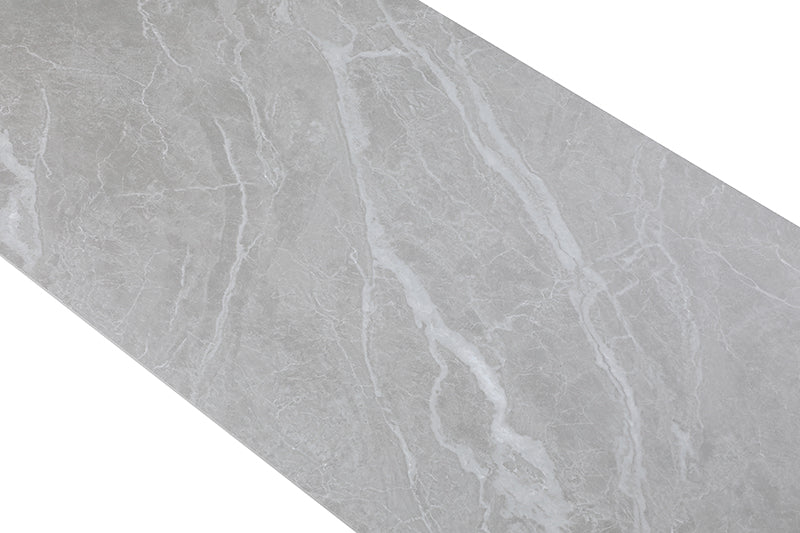 Stunning dining table adorned with a ceramic surface that perfectly emulates the elegant beauty of marble, bringing a touch of refined sophistication to your dining space. Table Top & ext : 12mm ceramic (GREY) Base: Sanded dark grey (SWH2476) powder coated metal Two 16'' Extensions Swivel Chairs: PU(grey SMK-53) Legs: stainless steel Color light grey