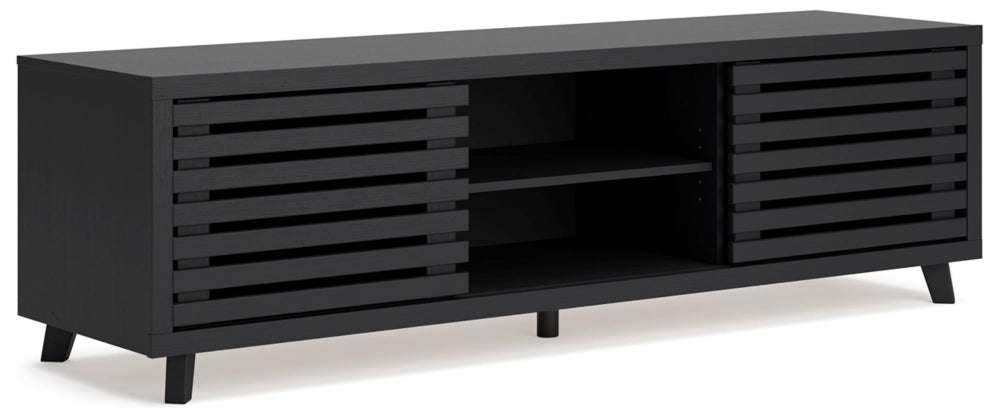 Entertain the art of modern living with this TV stand. Pairing a subtle wood grain look with a trend-right matte black finish, it’s beautifully in tune with your clean-lined design sensibility. Packed with potential, two sliding doors reveal even more adjustable shelving, just the ticket for storing your tech consoles, DVDs and games.