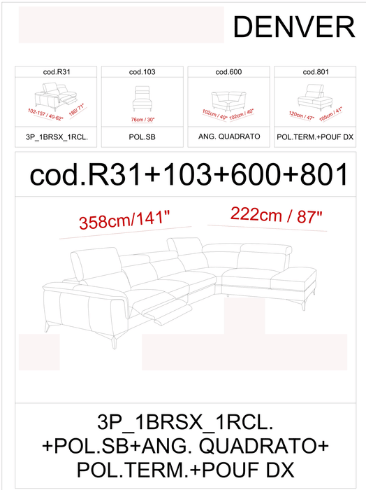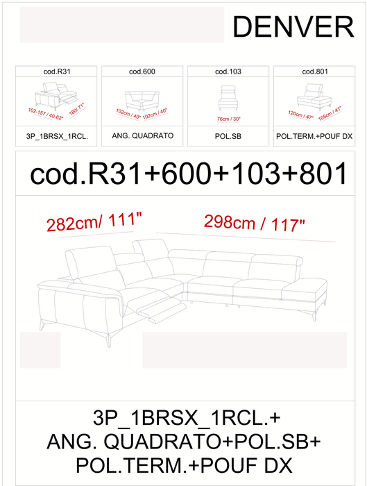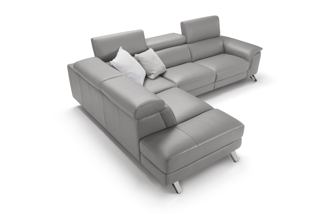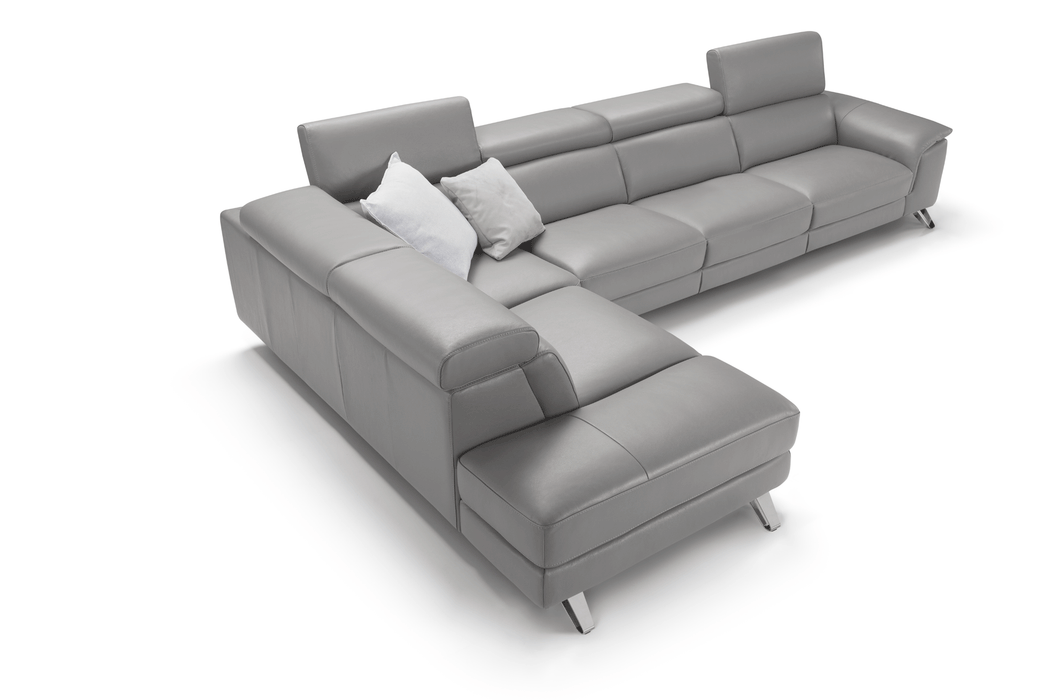 MADE IN ITALY COMING SOON TO STOCK... Introducing Denver, a sectional sofa that embodies the perfect synthesis of relaxation, elegance, and comfort. Designed to create a harmonious balance between style and indulgence, Denver invites you to unwind and luxuriate in its embrace while adding a touch of refined sophistication to your living space. Leather Col. Fume 317 CARCASS: Spruce chipboard and masonite and multilayer panels. PADDING: Stress-resistent polyurethane foam available in different densities. SEAT CUSHION: Stress-resistent polyurethane VITA foam covered with Dacron hollow soft polyester fiber. BACK: Stress-resistent polyurethane VITA foam covered with Dacron hollow soft polyester fiber. FEET: Metal