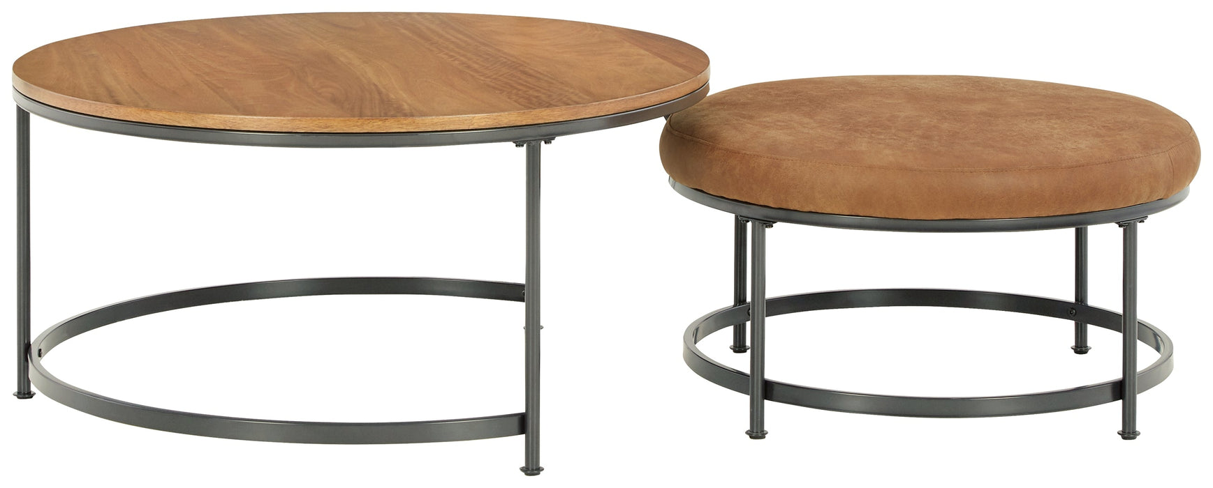 Set of 2 Includes coffee table and nesting ottoman Made of mango veneer and engineered wood Tabletop with light brown natural wood tone finish Black metal frame Firmly cushioned ottoman with caramel-colored faux leather upholstery Nesting design Assembly required