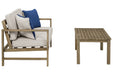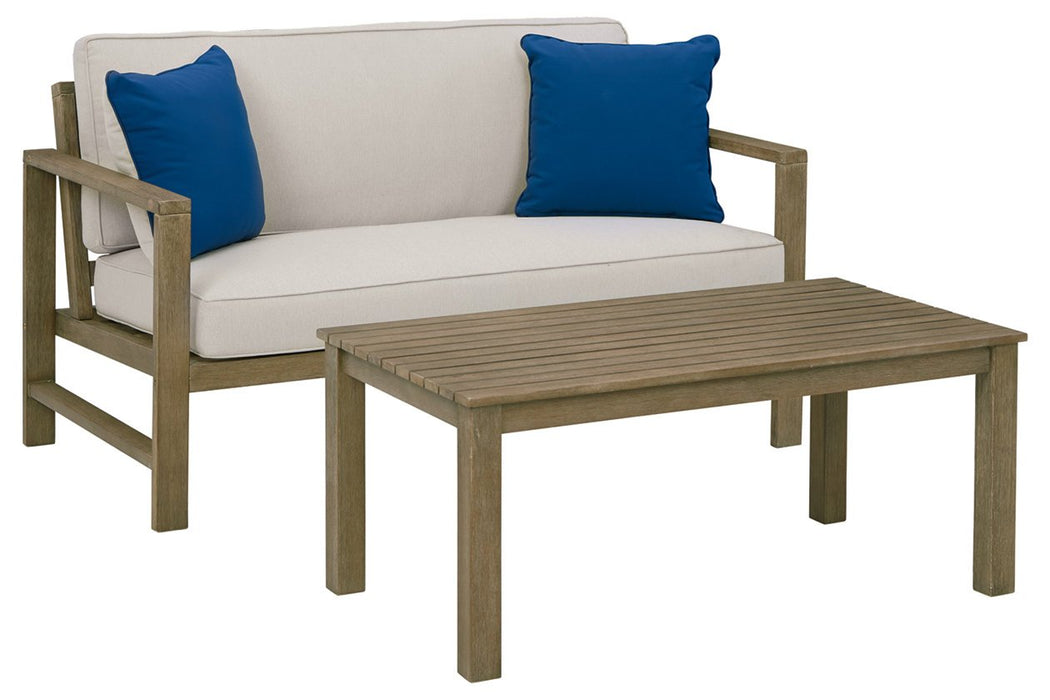 Fynnegan Light Brown Outdoor Loveseat with Table (Set of 2) | P349-035 | Signature Design by Ashley® | Lara Furniture