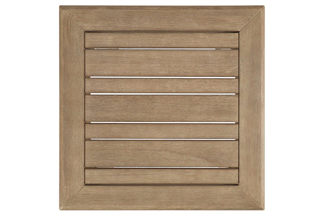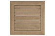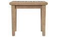 Discover a high style alternative to traditional outdoor furniture. With its antiqued teak-like finish, this solid wood end table definitely has the corner on style. Better yet, it has the edge when it comes to affordability. For that much more weather protection, the table's eucalyptus wood frame with slat styling is treated to a 5-step finishing process.
