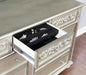 | Glam meets European traditional designs equals a graceful, tasteful, elegant bedroom suite * Silver metallic finish with a warm glaze high light that sparkles * Matte black velvet with bling tufted buttons next to antiqued mirrored frame work is sure to impress * USB ports to recharge in nightstand * Removable jewelry tray in dresser |