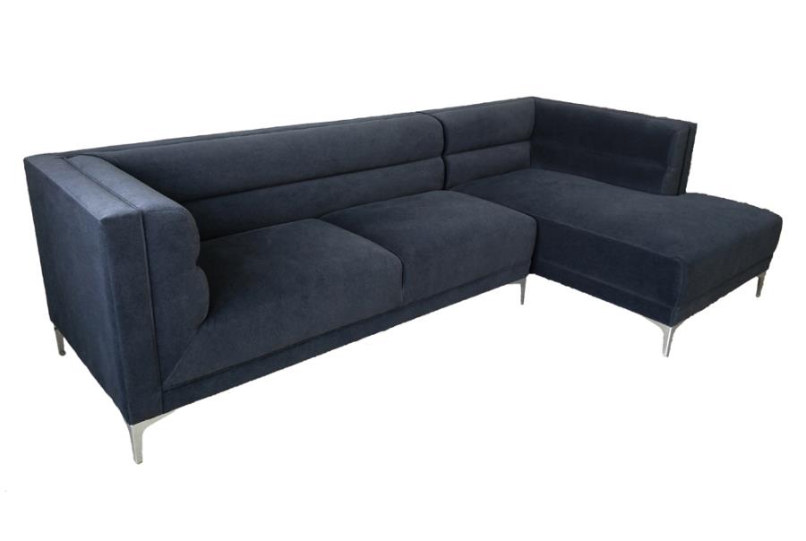 | * Update your living space with this modern two piece sectional * Stylish horizontal 3D channeling frame the seamless waterfall attached seats * Matte mohair-like velvet upholstery in indigo * Stainless steel tapered legs complete the look * Only available as shown with right arm facing chaise |