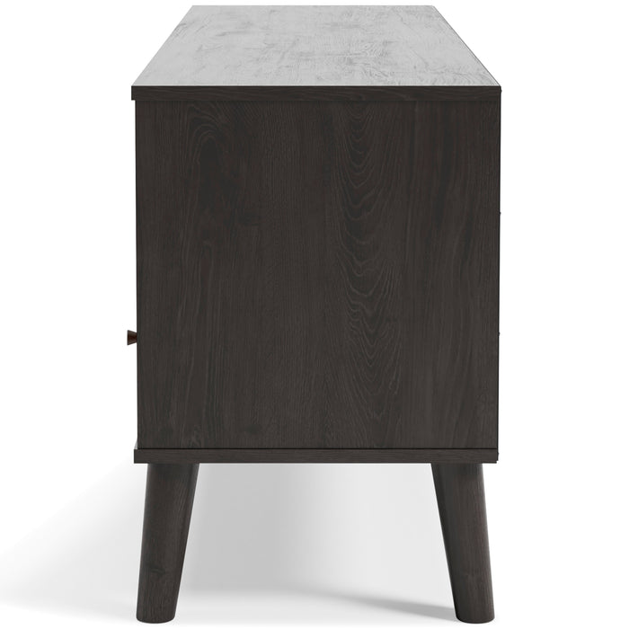 The perfect marriage of contemporary and casual style, this TV stand is a charming addition to your home. The entertainment center is expressive with its two-tone look in a dark charcoal finish and a replicated sugarberry wood grain pattern. The two smooth-gliding drawers and open shelving allow you to store electronic accessories with ease. Black knobs and splay legs add a finishing touch.