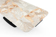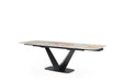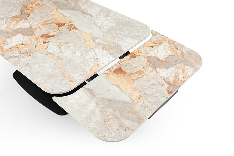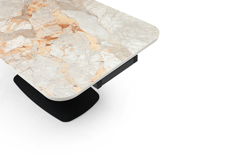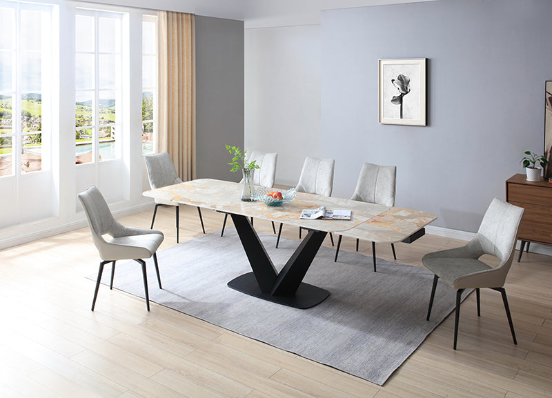 Sophisticated dining table with an extended ceramic top Table Top & ext : 12mm ceramic (X-Y9183A137) Base: Sanded black powder coated metal Two 16'' Extensions Swivel chairs Back PU: SMK-53 Front fabric: OTE MUSE color14 Beige (2 tones) Legs: Black powder coated metal