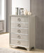 | Create a glamorous vibe in a master or guest bedroom. This gorgeous, silver chest emanates graceful elegance. A metallic silver finish gives it a lovely touch of sparkle. Mirrored acrylic accents add even more stunning shine. With five spacious English dovetail drawers, including a felt lined top drawer, this wooden chest is a stylish way to meet your storage needs. |