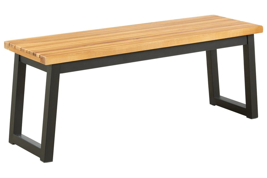 Bring an uptown feel to an outdoor space with this 3-piece outdoor furniture set. Designed to comfortably seat four, this ultra-cool outdoor dining table and bench set sets a new standard in outdoor living. The tabletop and bench seats are richly crafted of acacia wood with wonderful tonal variation. The tubular steel legs are sleek, sturdy and slightly canted for an interesting angled effect.